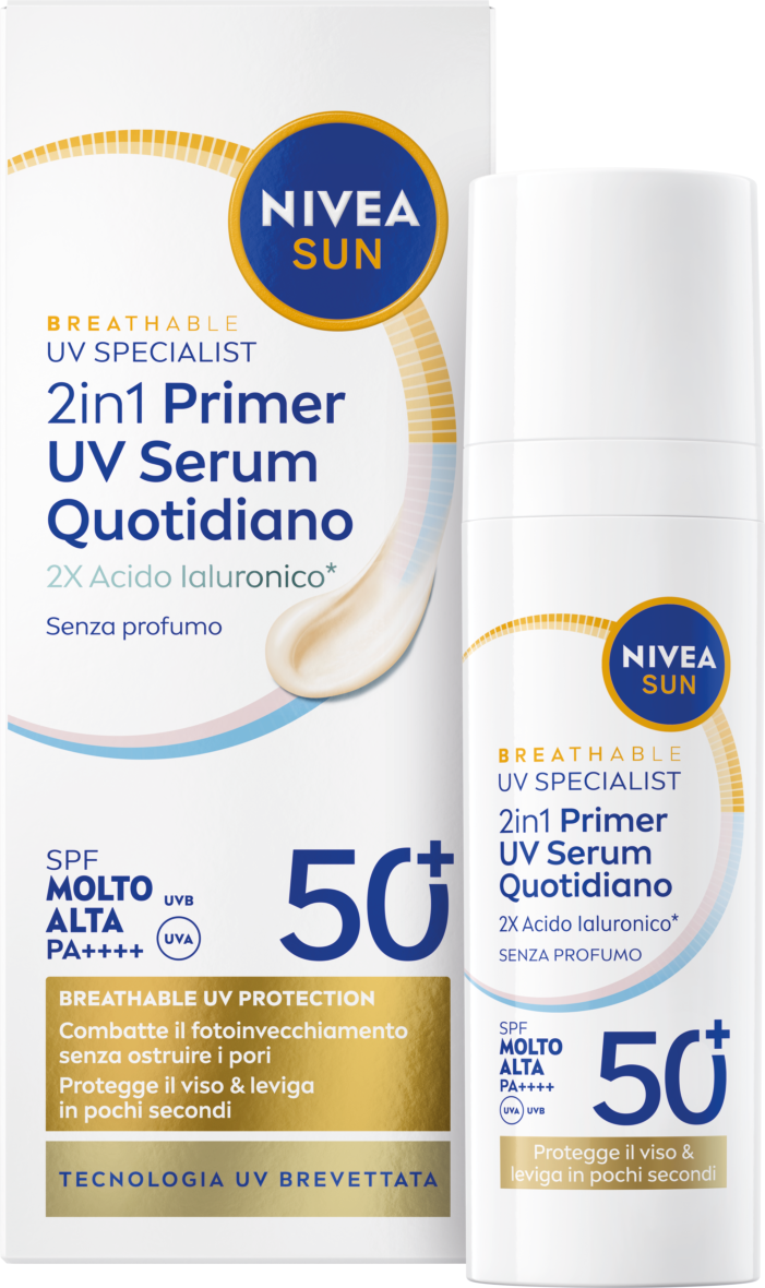 NIVEA SUN Breathable UV Specialist 2in1 Primer UV Serum QuotidianoSPF 50+ combatte il foto‑invecchiamento senza ostruire i pori. Protegge e leviga la pelle, prolungando la durata del make‑up.
