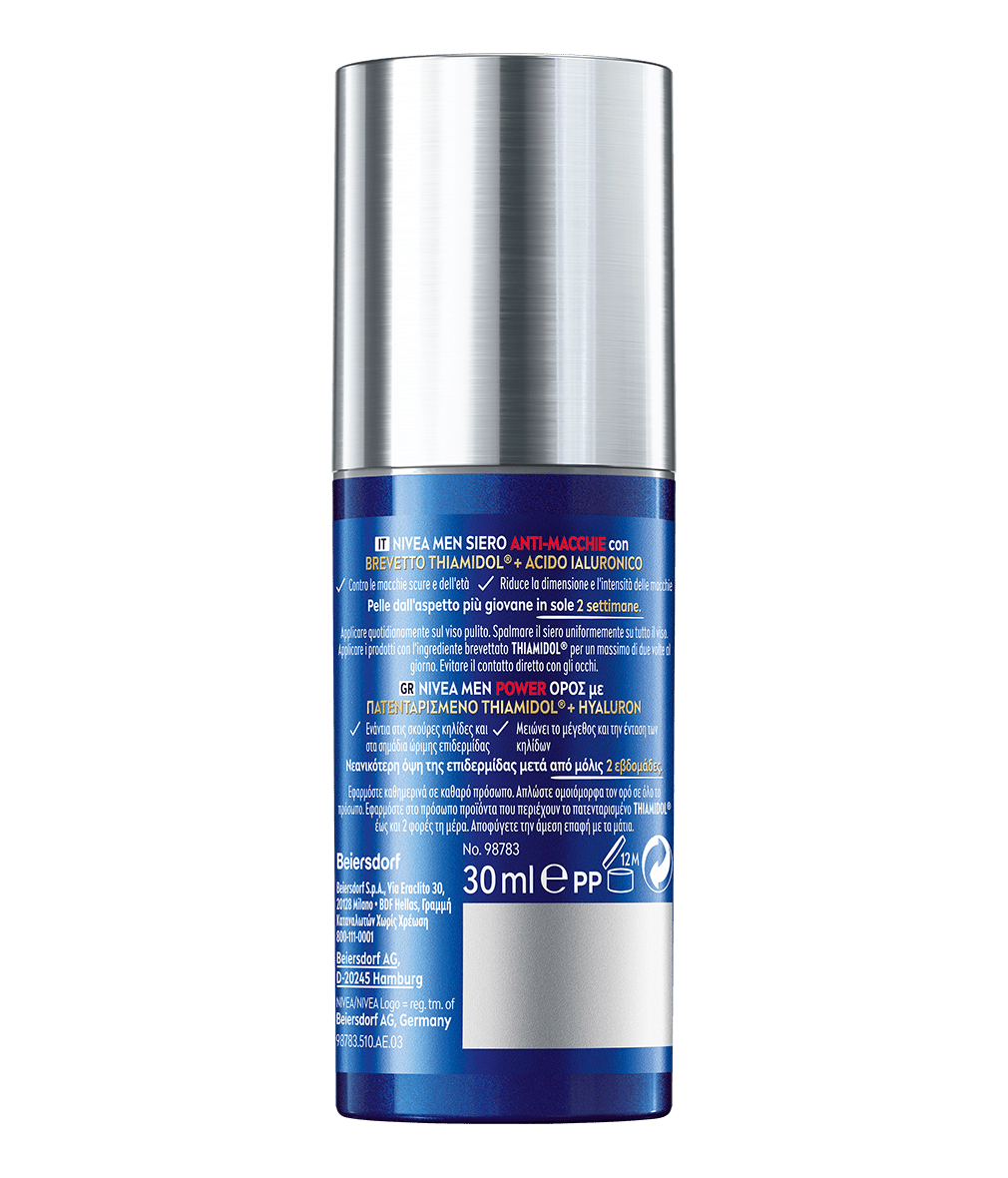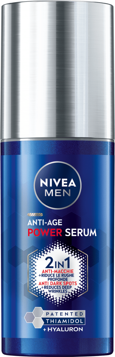 Il Siero Anti‑Age Power NIVEA MEN con Thiamidol® brevettato e Acido Ialuronico riduce visibilmente le macchie scure e le rughe profonde, prevenendone la ricomparsa. La formula ultra‑leggera e a rapido assorbimento è appositamente studiata per la pelle maschile, donando un aspetto più giovane in sole 2 settimane.