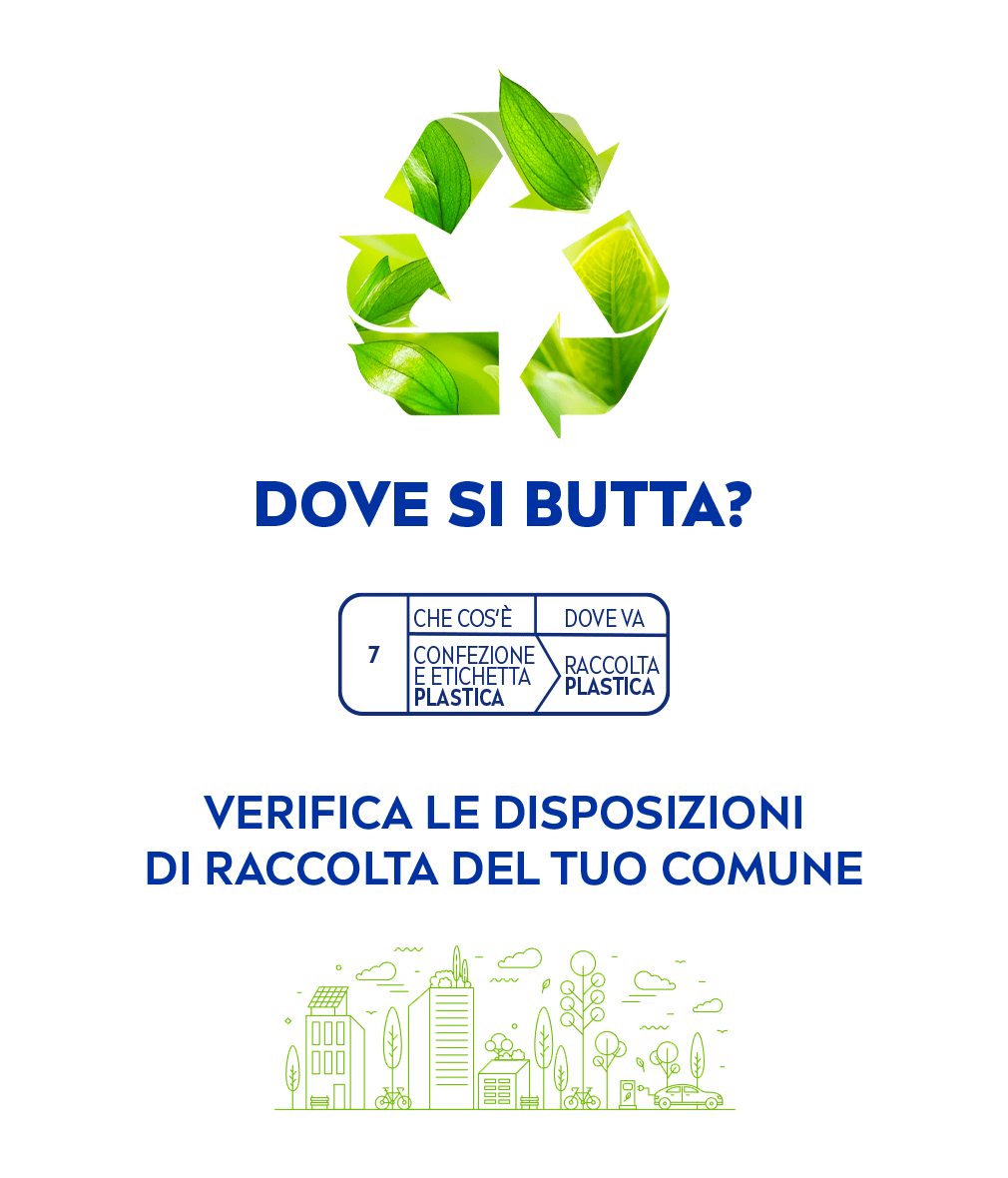 - Il 45% della confezione è realizzata con materiale riciclato